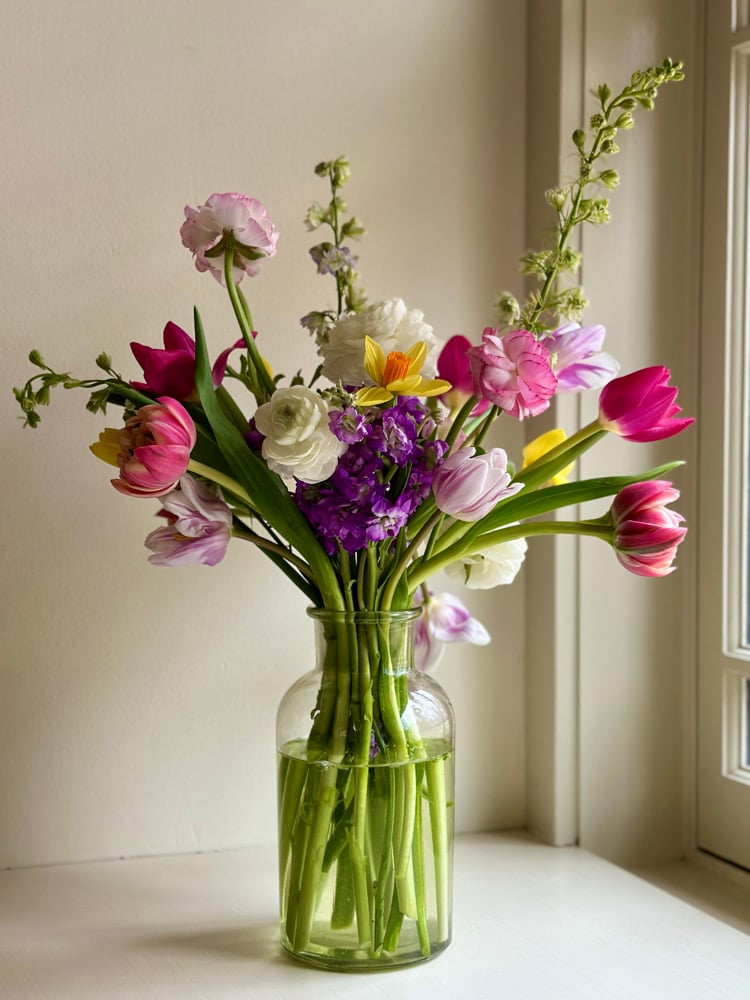 This year’s Mother’s Day arrangement is thoughtfully curated using gorgeous spring ephemerals. Specialty tulips, peonies, snapdragons, narcissus, and other lush spring stems, all beautifully arranged in a vase with fresh seasonal foliage.